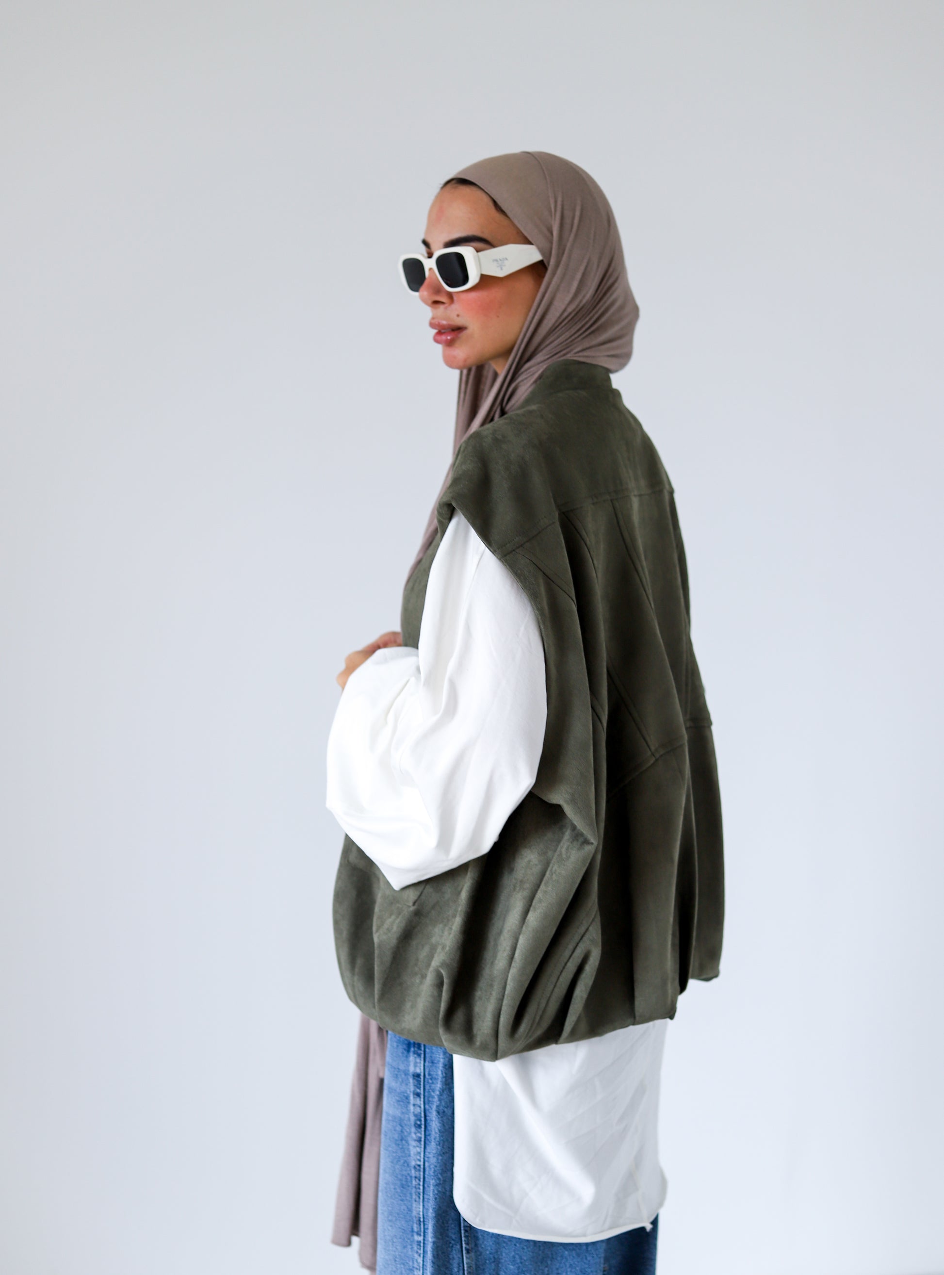 Bomber Pockets Suede Vest — Olive